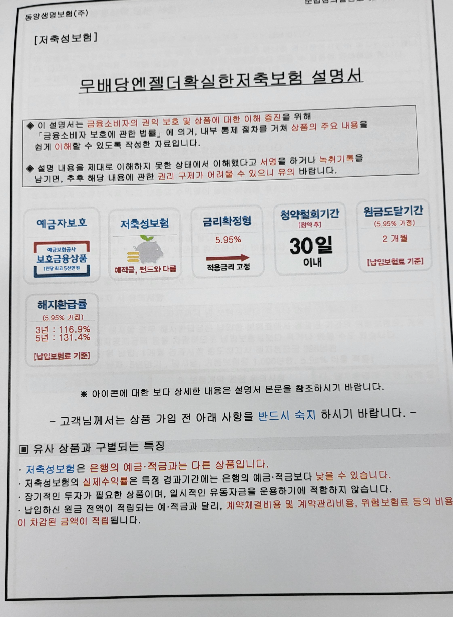 지금부터 이 제품의 장점과 단점, 주의할 점에 대해 이야기해보겠습니다. 가장 중요한 점은 이 상품은 보험상품이라는 점입니다. 따라서 은행 예금, 적금과는 다르며, 위 예시표는 고정금리 5.95%를 기준으로 작성되었습니다. 예금자보호법에 따라 예금보험공사는 취소환급금을 기준으로 1인당 최대 5천만원까지 보호해줍니다. 5천만원을 초과하는 잔액은 보호되지 않습니다. 금융회사 부도가 걱정된다면 최대 5천만원까지 가입하는 것을 추천한다. 별로 걱정하지 않는 사람들에게는 수억에서 수십억까지 할 수 있습니다. ^^