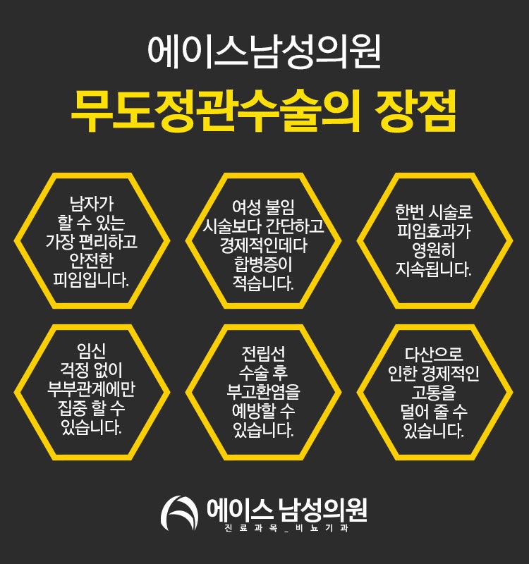 실제 효과 이론적 효과 금욕 100% 100% 정관수술 99% 99% IUD99% 99% 난관결찰 99% 99% 데포프로베라 97% 99% 피임약 92% 99% 콘돔 85% 98% 격막 84% 94% 페서리 68~84% 91% 피임스폰지 6 8~ 84% 91% 생리주기 모드 75% 95~97% 질외사정 73% 96% 살정제 71% 82% 피임법 없음 15% 15% 위의 표에서 알 수 있듯이 정관수술은 피임법 중에서도 이론성과 실용성이 높은 우수한 피임법 중 하나라고 할 수 있습니다. 따라서 의료 분야의 수요가 실제로 증가하고 있습니다. 그러나 정관 절제술이 모든 부부에게 최선의 선택은 아닙니다. 누구나 자신에게 가장 적합한 피임 방법이 있습니다. 각 피임 방법은 성공률과 비용 및 가용성이 다릅니다. 따라서 배우자 및 의료 제공자와 충분히 상의하여 각 부부에게 가장 적합한 피임법을 선택하시기 바랍니다. 나에게 맞는 피임법 찾기 피임법을 선택할 때는 기본적으로 다음과 같은 요소를 고려해야 합니다. 1) 비용이 얼마나 중요합니까? 2) 정기적인 파트너가 있습니까? 3) 성병 예방이 필요합니까? 4) 당신의 성생활은 얼마나 활발합니까? 5) 피임을 얼마나 열심히 할 수 있습니까? 6) 언젠가 아이를 원하십니까? 7) 건강은 어떻습니까? 정상적인 치유를 촉진하기 위해 수술 전후에 금연할 수 있습니까? 8) 현재 복용하고 있는 약이 있습니까 위의 요인 외에 배우자의 건강도 고려해야 합니다. 다음과 같은 기타 질문: 9) 피임 방법이 여성의 월경 주기에 영향을 미칩니까? 10) 유방암이나 난소암의 가족력이 있습니까? 이 10가지 질문에 답한 후에도 어떤 피임 방법이 자신에게 적합한지 잘 모르겠다면 의사와 상담하십시오. 의사를 찾는 것이 다소 번거로울 수 있지만 장점은 각 피임 방법에 대한 생식 건강의 모든 측면을 분석할 수 있고 Truman은 여러 피임 방법 중 하나인 정관 절제술을 전문으로 한다는 것입니다. 정관수술에 대해 궁금하신 사항이 있으시면 언제든지 문의주세요. 평균 정관수술 비용은 병원이나 개인의 의학적 상태에 따라 차이가 있을 수 있으나 작성일(2019.03.25) 기준 평균 정관수술 비용은 30만원(정관수술 없음)에서 40만원(불면 정관수술) 사이입니다. 실손보험을 포함한 모든 보험은 적용되지 않습니다. 수술 비용은 무엇보다도 의료 기관의 전반적인 기술 수준과 의료 서비스의 내용에 따라 달라질 수 있습니다. 따라서 평균 이하의 파격적인 가격을 제시하는 곳이 있다면 병원의 시술 성공률과 환자 만족도를 조금 더 조사해 볼 가치가 있을 것이다. 정관수술의 장단점 10~20분 정도 소요되는 간단한 시술이라고 하지만, 인생을 바꾸는 사건인 만큼 관련자들이 시술을 결정할 때 최대한 균형 있게 고려하게 될 것으로 생각된다. 정관 수술의 주요 장점과 단점은 다음과 같습니다. 아래 내용을 읽어보셨다면 이 수술이 본인에게 맞는지 어느 정도 파악이 되실 거라 생각합니다. 장점 정관 절제술의 주요 장점은 다음과 같습니다. 1) 성생활에 긍정적인 영향을 미칠 수 있습니다. 2) 보다 효과적이고 안전한 피임법입니다. 3) 여성 배우자의 건강을 향상시킬 수 있습니다. 4) 여성의 피임수술에 비해 간단하고 저렴한 시술입니다. 각 항목에 대해 자세히 알아보십시오. 01 성생활에 긍정적인 영향을 미칠 수 있습니다. 정관수술은 임신에 대한 두려움이나 불안이 사라지기 때문에 부부의 성생활과 성적 만족도에 긍정적인 영향을 줄 수 있습니다. 통계적으로 대부분의 부부는 수술 후 성행위 빈도가 증가했다고 보고합니다. 남성 피임 수술은 정자의 배출을 막지만 테스토스테론에는 영향을 미치지 않기 때문에 성욕 감퇴나 발기부전 등의 문제는 없다. 사정 감각에 영향을 미치지 않으며 정액의 양에도 영향을 미치지 않습니다. 02는 비교적 효과적이고 안전한 피임법입니다. 여러 연구에 따르면 정관 절제술은 약 99%의 임신 예방 효과가 있어 아이를 원하지 않는 부부에게 이상적입니다. 일부 논문에서는 99.9%까지 보고합니다. 또한 단기적인 건강 합병증이 있을 수 있지만 장기적인 영향은 거의 보고되지 않았습니다. 03 여성 배우자의 건강 상태가 좋아집니다. FDA에 따르면 대표적인 피임법 중 하나인 여성의 경구 피임약은 현기증, 기분 변화, 체중 변화, 메스꺼움 등의 문제를 일으킬 수 있으며 고혈압, 혈전, 심장마비, 뇌졸중 등의 심혈관계 질환을 유발하는 경우는 극히 드물다. 일부 약물은 또한 불규칙 출혈, 유방 압통, 경련, 골반 염증성 질환, 불임 및 성욕 감소를 유발하는 것으로 보고되었습니다. 정관수술을 하면 여성의 경구 피임약 부작용을 예방할 수 있습니다. 04 여성의 경우 피임수술보다 저렴하고 간편합니다. 남성 피임수술은 30~40만원으로 여성 난관 결찰술보다 훨씬 저렴하다. 또한 시술 시간이 비교적 짧고 침습성이 적어 통증이 적고 회복이 빠릅니다. 합병증도 드문 것으로 보고되었습니다. 사망은 여성 피임 수술의 가장 심각한 부작용으로 보고되고 있지만, 아직까지 세계적으로 정관수술로 인한 사망은 없다. 국소마취로 시행하기 때문에 전신마취가 필요한 난관 결찰술에 비해 몸에 부담이 적다는 장점도 있다. 이러한 다양한 이유로 매년 아내보다 더 많은 남성이 정관 수술을 받고 있습니다. 단점 
