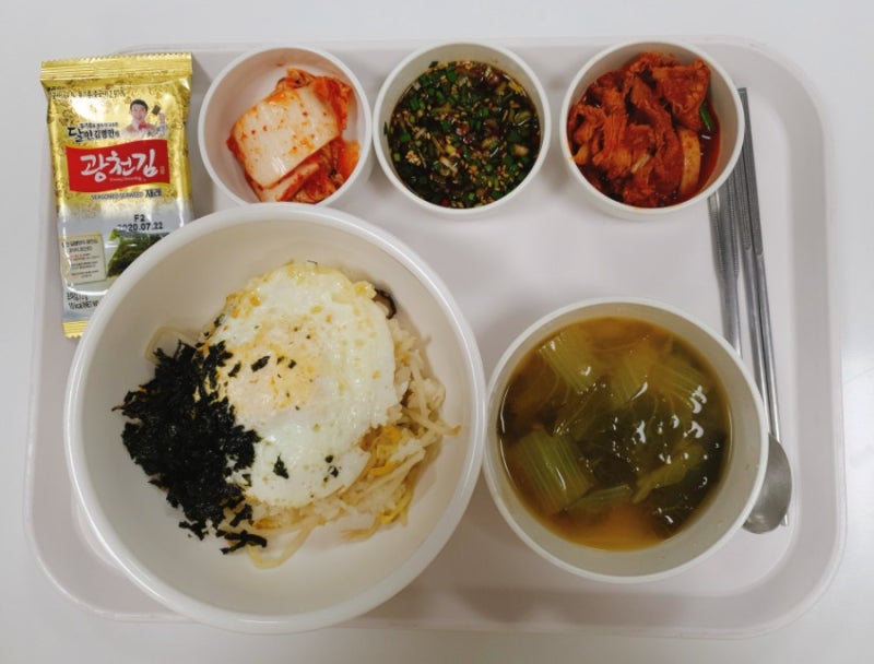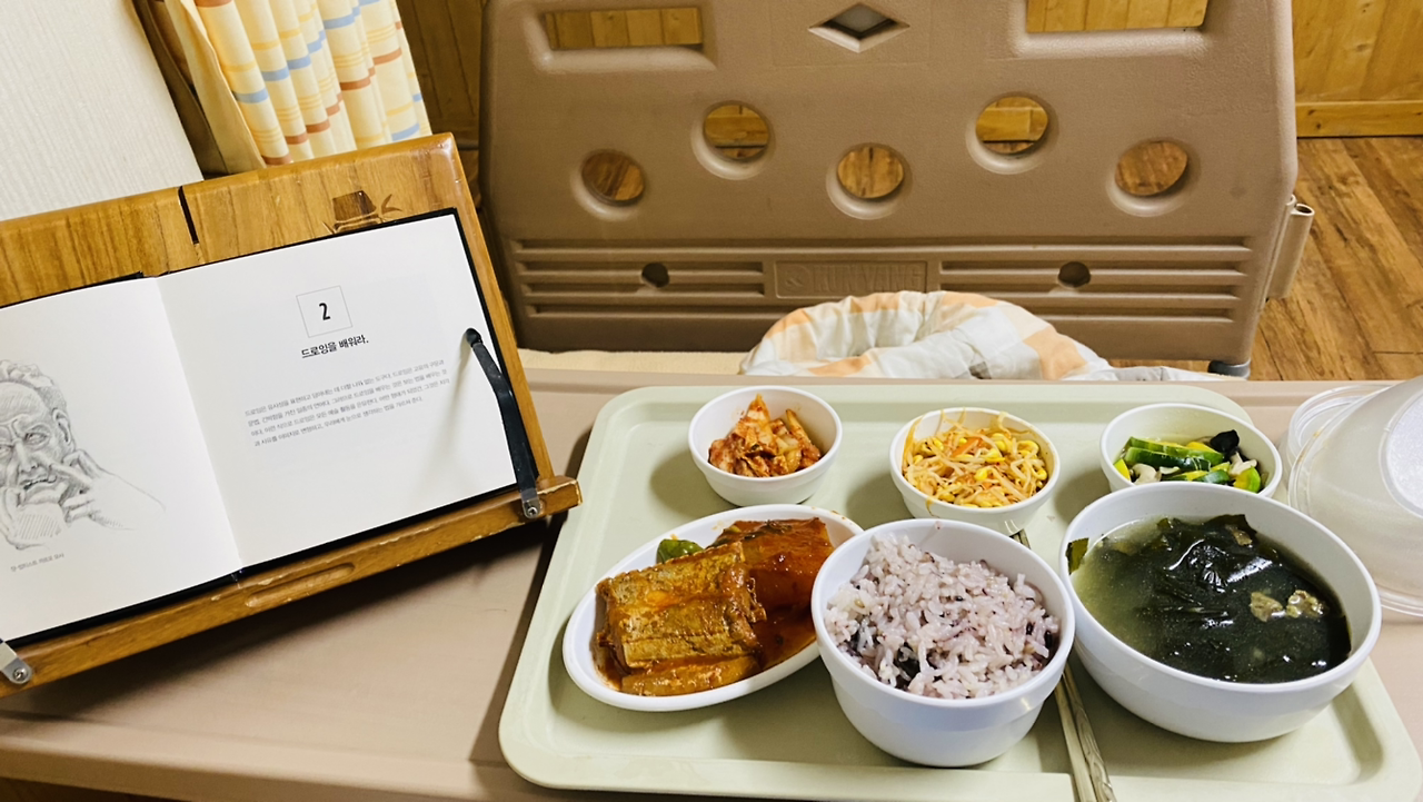 병원 급식 메뉴 일요일 점심 메뉴는 쇠고기 불고기와 시금치를 식초와 고추장으로 양념한 맑은 국물과 우엉 조림이었습니다.