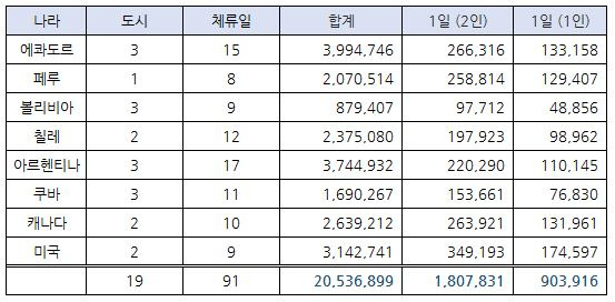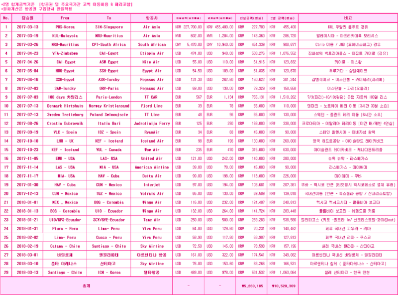 * 북미 1) 미국(여러 번 방문) * 중앙 아메리카 2) 멕시코(2021년 방문) 3) 과테말라 4) 벨리즈 5) 온두라스 6) 엘살바도르 7) 니카라과 8) 코스타리카 9) 파나마 * 남미 10) 콜롬비아 * 아시아 11) 인도(2009, 2012, 2013년 방문) 12) 방글라데시 13) 부탄 14) 태국(여러 번 방문) 15) 베트남(여러 번 방문) 16) 대만 * 유럽 17) 영국(여러 번 방문) 18) 아일랜드 제 세계 여행의 시작은 미국 뉴욕이었습니다. 그리고 제가 가장 기대했던 여행지는 중앙 아메리카였습니다. 미국 미네소타주에 있는 친구 집에서 보낸 일주일의 전반적인 여행 컨셉은 백패킹이었고, 유럽(영국과 아일랜드)은 캠핑카로만 여행했습니다. J와 제 11주년을 축하하기 위해 인도에 들렀습니다. 저는 잠깐 들를 예정이었지만 결국 두 달 동안 머물렀습니다. 11년 만에 처음 만난 곳(인도 자이살메르)으로 돌아갔습니다. 이번에는 인도에서 에어컨이 있는 2등석 기차를 탔습니다(11년 전에는 4등석 침대칸만 탔습니다). 부탄은 J의 버킷리스트에 있었습니다. 여행 블로깅 관련 업무 때문에 여행 중간에 태국, 베트남, 대만을 다녀왔고, 한 달간 휴가를 냈습니다. 파나마는 지금까지 제가 여행한 100번째 나라였습니다. 저는 오랫동안 100개국 여행을 특별한 방식으로 축하하고 싶었지만, 그저 평범하게 지나갔습니다. 숫자가 별 의미가 없는 것 같았습니다. 파나마의 작은 마을 파나마 수도 파나마시티에서 2만원짜리 게이샤 커피 한 잔 2. 이 BEST 이번 여행에서 가장 좋았던 나라 BEST 31) 중앙아메리카 니카라과 2) 남아메리카 콜롬비아 3) 부탄 세계여행을 마치고 보니 이번 세계여행에서 정말 정말 마음에 드는 나라가 하나도 없었습니다.과테말라는 기대가 컸는데 실망이 컸습니다.니카라과는 관광객이 많지 않고 조용하고 사람들이 친절해서 좋았습니다.니카라과의 활화산 니카라과의 정글보트 투어 니카라과의 단순하고 맛있는 중앙아메리카 음식 니카라과에서 여유롭게 시간을 더 보냈으면 좋았습니다.부탄도 좋았지만 제약이 너무 많았습니다.우선 부탄은 자유롭게 여행할 수 없어서 가이드와 운전자와 함께 여행해야 합니다. 그래서 내가 원하는 스타일로 여유롭게 여행도 못 하고, 늘 그들과 함께 있는 것도 불편했다.그리고 1인 1일 15만원인 관광세도 있다.우리는 2명이라 7박 8일 여행동안 200만원이 넘는 세금을 냈다.게다가 비싼 숙박비와 가이드비, 차량비도 엄청났다.아름다운 여행지였지만 매일같이 계산되는 세금 때문에 서둘러 여행을 떠날 수밖에 없었다.맛있는 음식이 가득한 최고의 나라들 31) 멕시코 2) 태국, 베트남, 대만 3) 부탄 타코의 나라 멕시코는 음식 때문에 자주 방문하고 싶은 여행지이다.고기, 아보카도, 토마토, 그리고 다양한 길거리 음식들.멕시칸 음식태국, 베트남, 대만은 한국인인 내 입맛에 자연스럽게 맞는다.놀랍게도 음식이 가장 맛있는 나라는 부탄이었다.평소에는 먹지 않는 새로운 현지 음식을 맛볼 수 있었다. 3. 9개월 & 2인 세계여행 비용 -> 지금까지 3600만원 2명이 9개월간 세계여행을 가는 비용은 약 3600만원입니다. 한 달에 평균 400만원 정도. 9개월 총 항공료 : 600만원 미국(8일) : 53만원(친구집) 멕시코(16일) : 160만원 과테말라(14일) : 160만원 엘살바도르,온두라스(13일) : 180만원(다이빙) 니카라과(12일) : 120만원 코스타리카(20일) : 380만원 파나마(15일) : 200만원 콜롬비아(23일) : 200만원 인도, 방글라데시(56일) : 350만원 부탄(8일) : 320만원 영국, 아일랜드(45일) : 500만원(캠핑카, 영국에서 프랑스까지 왕복 페리 포함) 숙박비가 대체로 저렴해서 더블룸을 예약했고, 음식도 아끼지 않았어요. 스쿠버 다이버라 다이빙에 돈을 많이 썼어요. 중앙아메리카, 동남아시아, 인도 등 비교적 저렴한 나라들에 비하면 여행비가 비싼 편이었다. 부탄은 현지에서 묵는 데 하루 40만원 정도가 들었다. 코스타리카도 여행비가 매우 비쌌다. 미국인들에게 인기 있는 여행지라 생활비가 미국과 거의 비슷하다. 야생동물을 많이 볼 수 있는 코스타리카에서 우리는 인기 있는 나무늘보개미핥기를 보기 위해 2박 1일 투어에 80만원(2인 기준)을 지불했다. 이번 세계일주는 약 2년 정도 걸릴 예정이고 총 비용은 1억원이 될 것으로 예상되지만 이 금액이 가능할지 조금 걱정이다. 앞으로 여행할 나라들은 대부분 미국, 캐나다, 호주, 뉴질랜드, 팔라우 등 비싼 나라들이다. 4. 세계여행 후기 미국, 중미, 남미를 여행하기 전까지는 너무 행복해서 시간이 멈추었으면 좋겠다고 바랐어요. 중남미 여행을 마치고 인도에 온 후(세계여행을 시작한 지 약 5개월 후) 여행을 점점 즐기지 못하게 됐어요. 제 생각엔 인도 바라나시에서 J와 제가 둘 다 심하게 아팠을 때였던 것 같아요. 그때부터 여행을 해야겠다는 생각이 들었어요. 하지만 멈추고 집에 가고 싶지 않았어요. 정말 아이러니했어요. 방글라데시에서 가보고 싶은 곳이 너무 많은데, 벌써 40이 넘었으니까 여행을 할 시간이 충분하지 않은 것 같아요. 그래서 여행을 멈출 수가 없어요. 하지만 지난주에 집에 돌아왔을 때는 사실 행복했어요. 아무것도 하지 않아도 되어서 행복했어요. 숙소 예약, 버스 예약, 먼 거리 이동, 관광을 하지 않고 