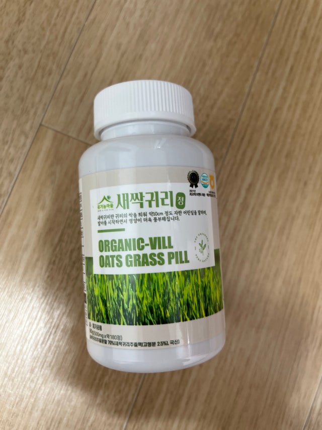 Organic Village 새싹 귀리 정제, 500mg 병 1개, 180정. 하루 3알씩 섭취하시면 2달은 새싹귀리 한알에만 집중하실 수 있습니다. 장점은 용량이 크다는거! 그냥 생각날 때마다 씹어 먹는 편이에요.