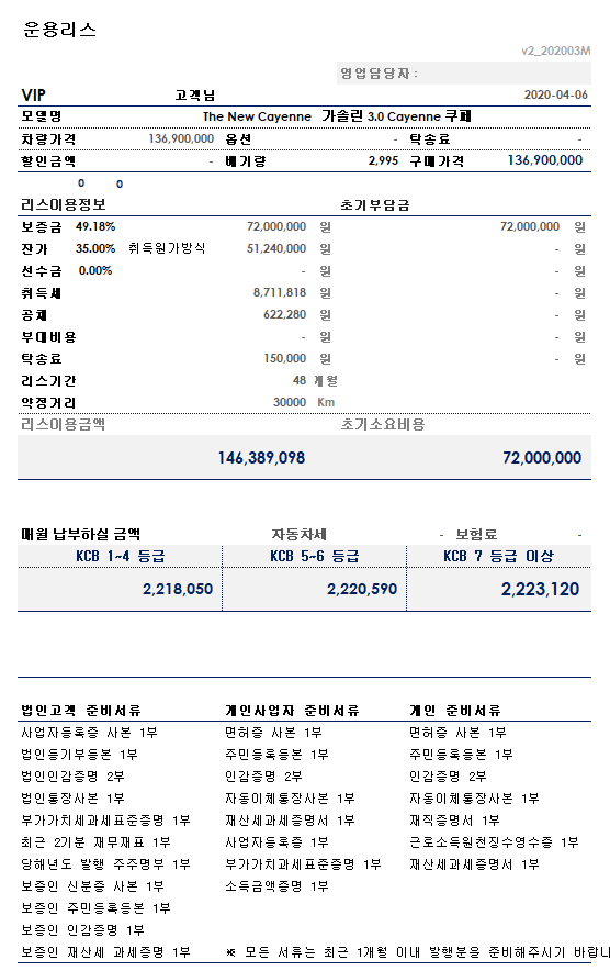 다만, 원하는 기간 내에 받을 수 있는 방법이 있습니다. 포르쉐 카이엔 리스 차량입니다. 이미 예약된 수량이므로 견적만 받아도 바로 차량을 받으실 수 있습니다. 원하시는 옵션, 색상 등을 알려주시면 조건에 맞춰 최대한 빠르게 차량을 인도해드릴 수 있습니다. 그럼 아래 링크를 통해 문의사항을 남겨주세요. 우선 가격은 1억3310만원으로 책정됐다. 가장 기본적인 모델은 이 정도이며, e-하이브리드 모델은 조금 더 높은 가격으로 만나보실 수 있습니다.